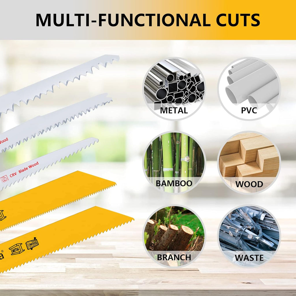 - ★ 【Sawzall Blades Metal & Wood】 - 4x 6" Wood 6TPI, 2x 8" Wood 6-10TPI, 2x 9" Pruner/Wet wood 5TPI, 1x 6" Metal blades 24TPI, 1x 6" Metal blades 18TPI, 1x 6" Metal blades 14TPI, 1x 6" Metal blades 10TPI. Different sizes to meet your different needs. With 2 colors silver and yellow which better differentiate of usage scenarios. The color of silver is more suitable for wood, and the yellow one is suitable for metal.
