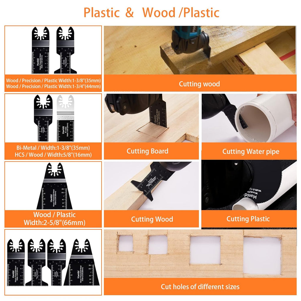 • ★【High Quality Oscillating Saw Blades kit】120 pcs Multitool Quick Release Saw Blades include 8 different types of saw blades, for cutting wood, metal, plastic and other materials, each type of saw blade is specific for a particular purpose. Our oscillating saw blades can meet a variety of needs, which could be used for workshop, household or other place.