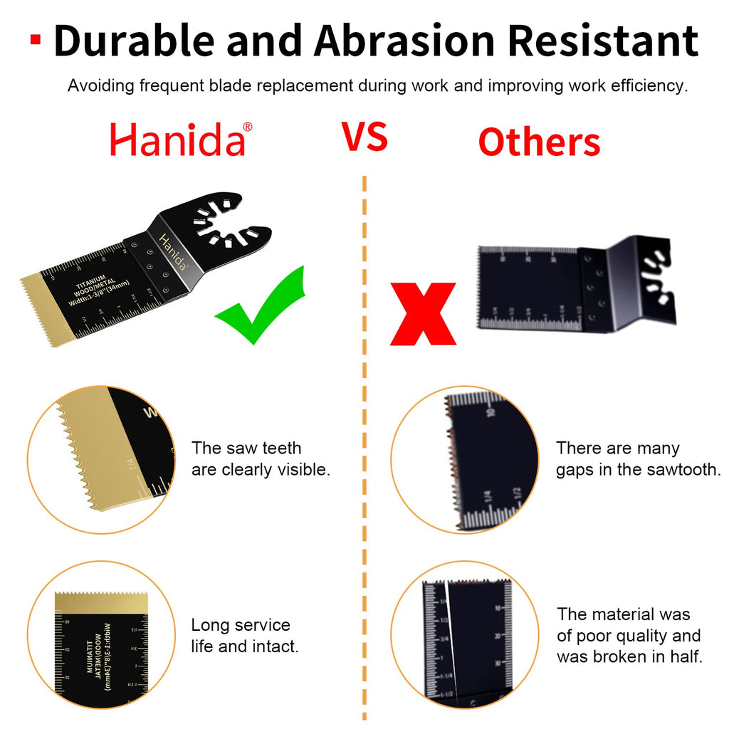 - 【Founded in California in 2010 】 - Hanida is one of the earliest research and development teams for oscillating saw blades products. In 2010, the company launched one of the world's first oscillating tool blades, which has abrasion resistance, temperature resistance, super hard performance. This is a unique new metallic material technology.